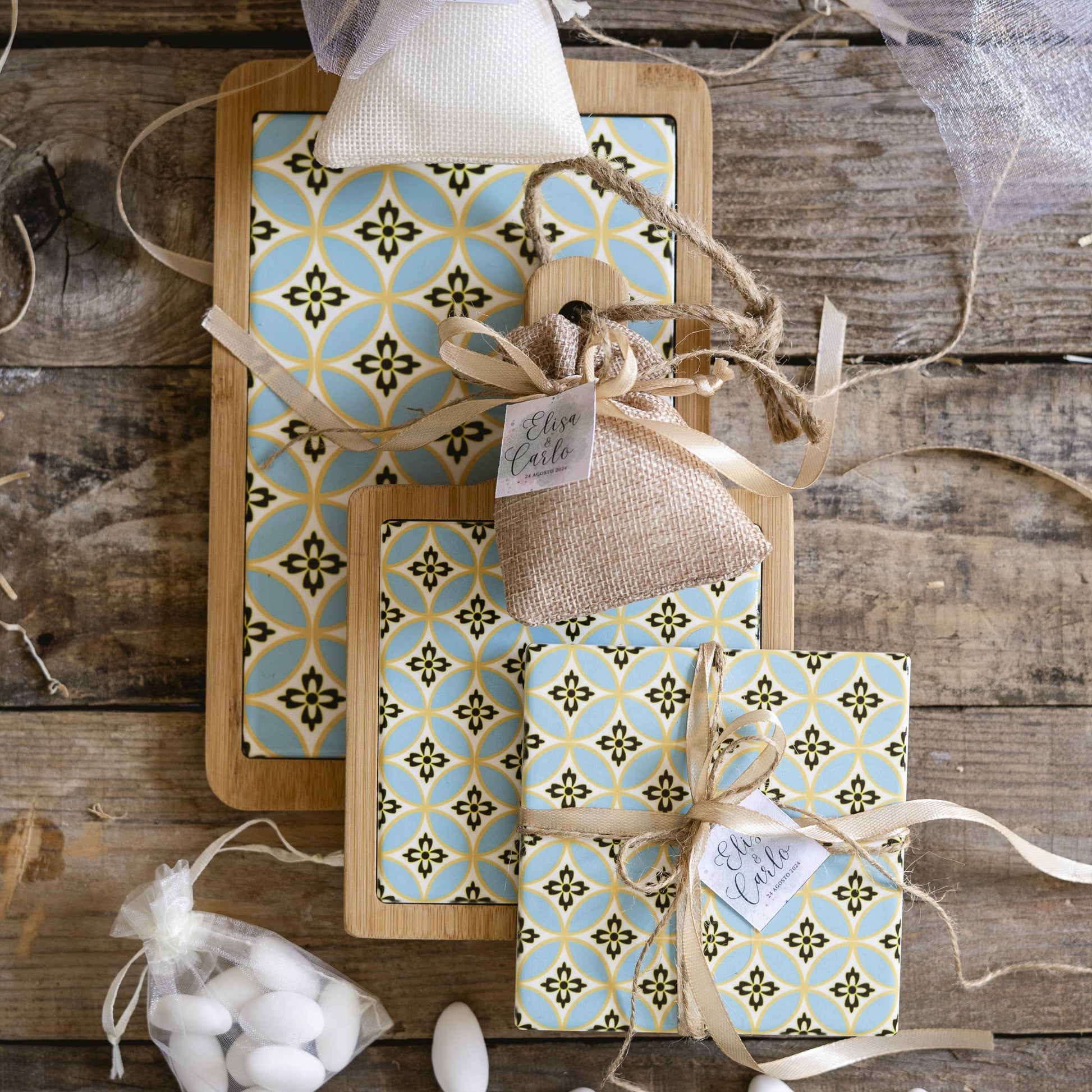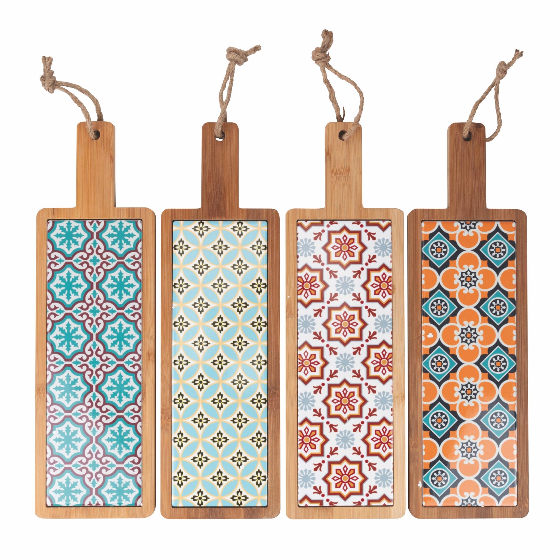 Apportez une touche de soleil à vos apéritifs avec cette planche à découper en bambou ornée d’un carreau central en céramique au motif portugais coloré.